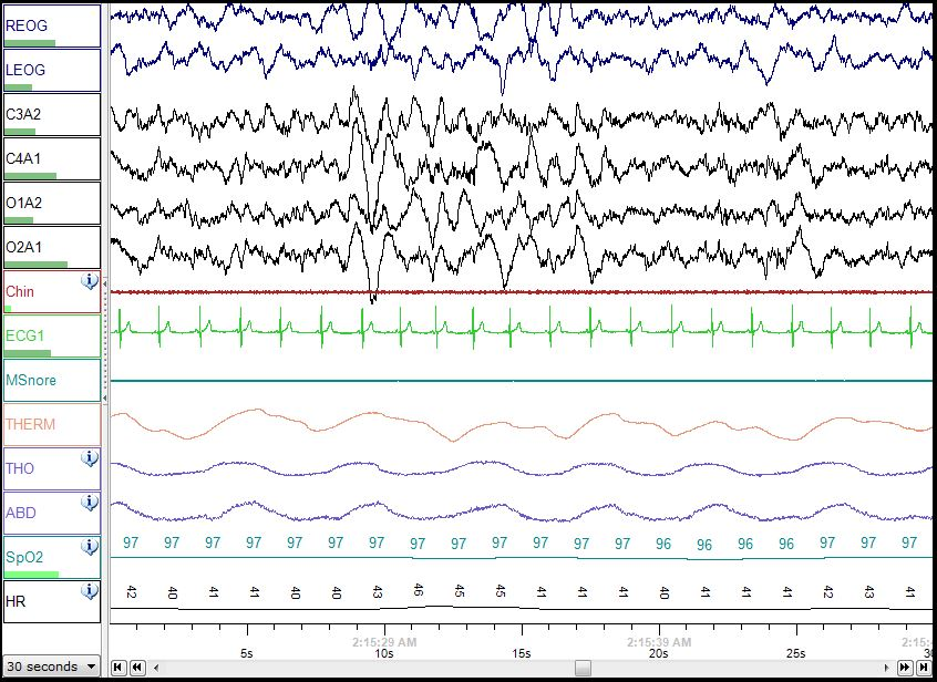 By dividing the test into sections of normal sleep, and sleep assisted by the CPAP machine, the resulting polysomnograms would allow my doctor to compare the quality of my sleep both with and without use of the CPAP. (Note that the two halves of the test, without and with CPAP, may be conducted in separate visits, especially if this is your initial sleep study).